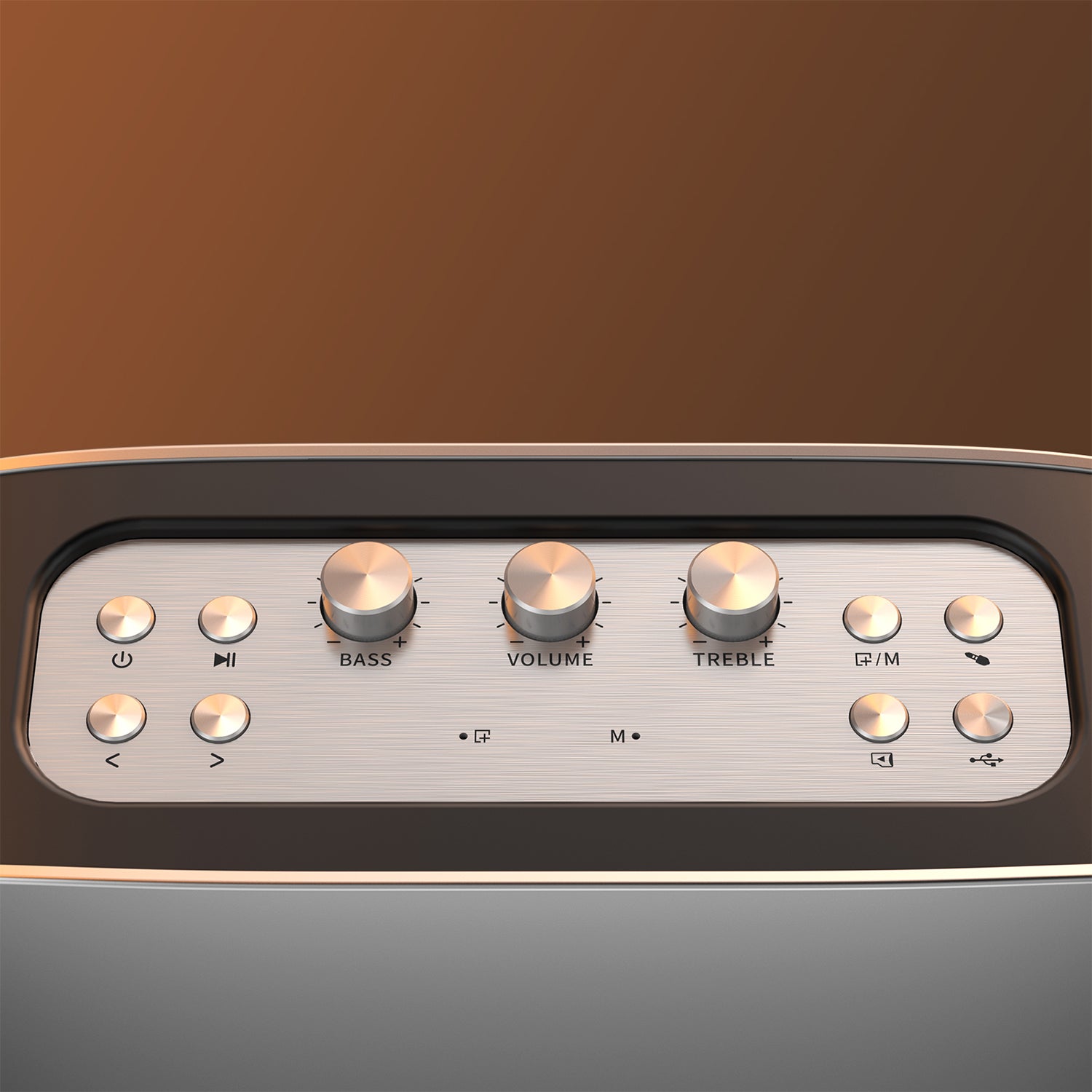 Personalize your sound with intuitive analog knobs for bass, treble, and volume on the top panel. Press down to lock for worry-free listening. From energetic parties to cozy nights in, adjust the audio effortlessly to suit any vibe or preference.
