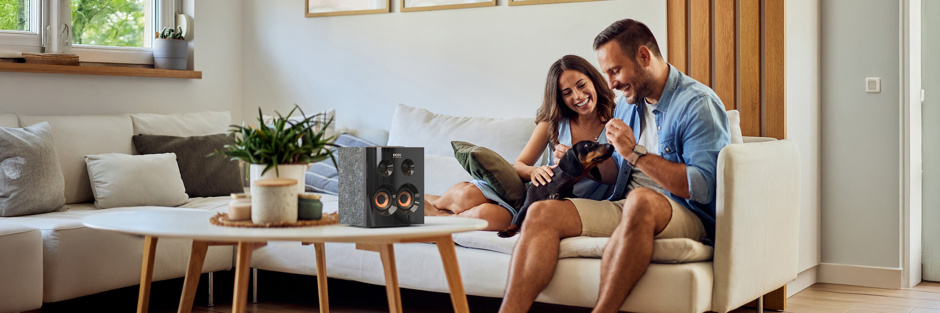 Wirelessly pair two SoundBox H300 speakers for immersive stereo sound that brings your music and movies to life with vibrant, room-filling audio.
