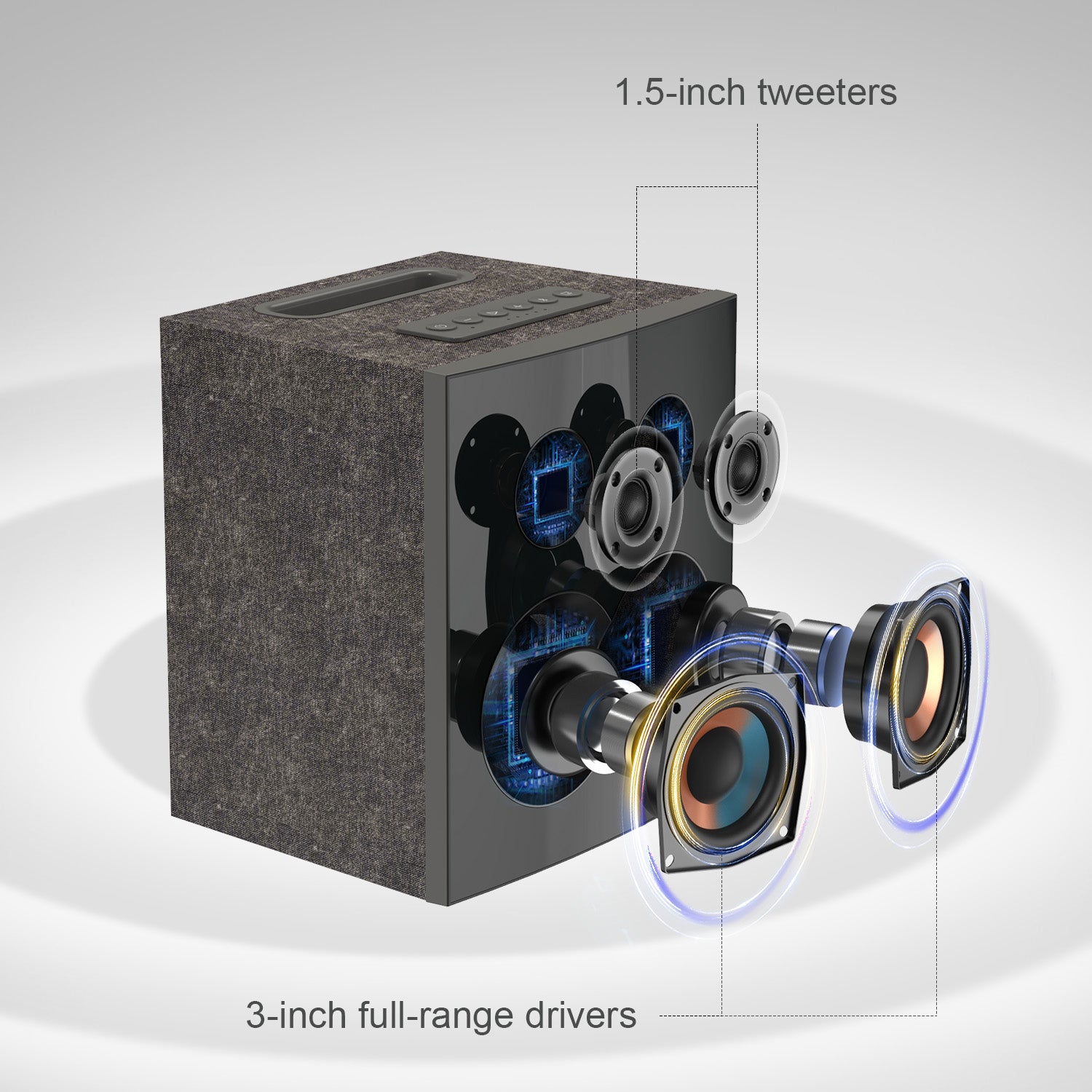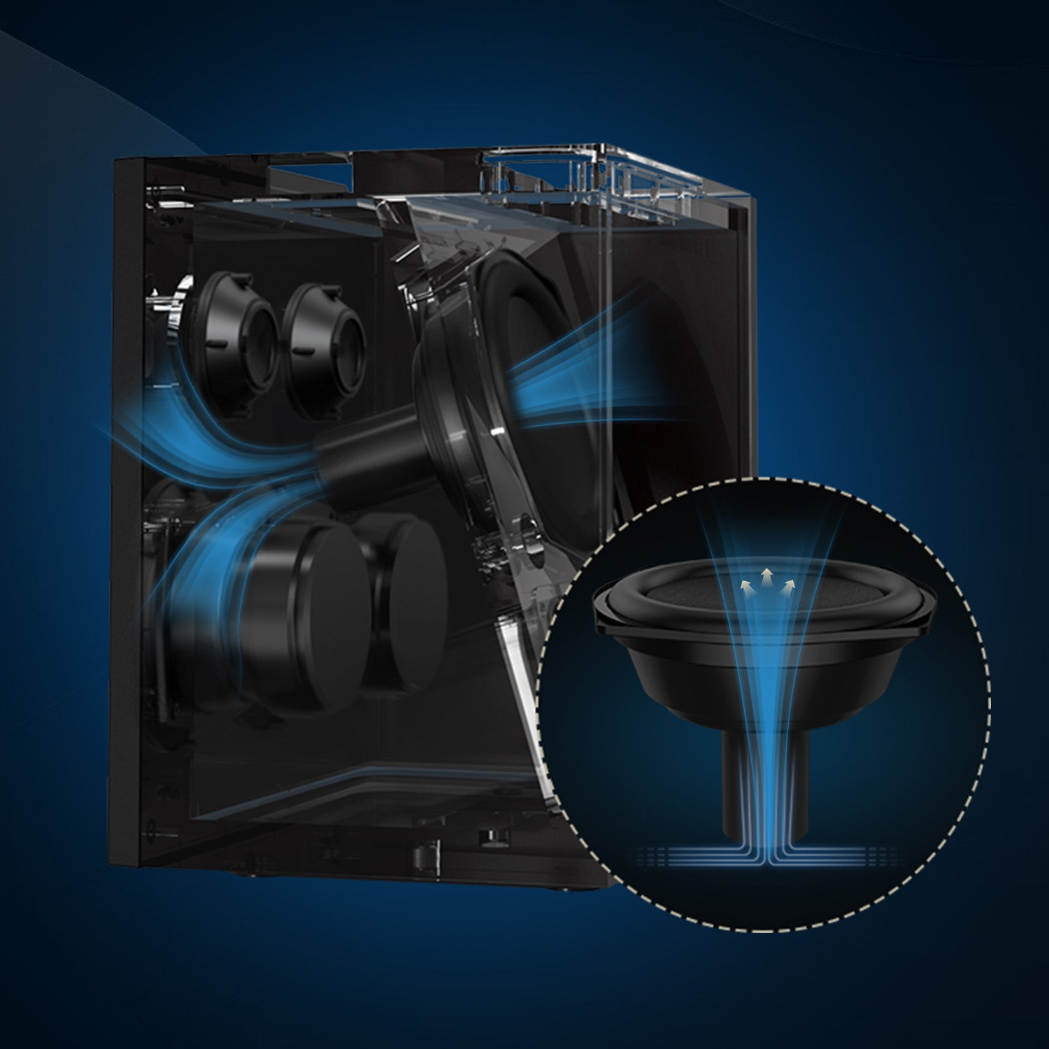 Powered by dual 35W full-range drivers, dual 10W tweeters, and a passive radiator, the SoundBox H300 Bluetooth speaker delivers 90W of rich, full-range sound. Enhanced by three advanced DSP technologies, it ensures deep bass, crisp treble, and minimal distortion for an immersive music or movie experience.