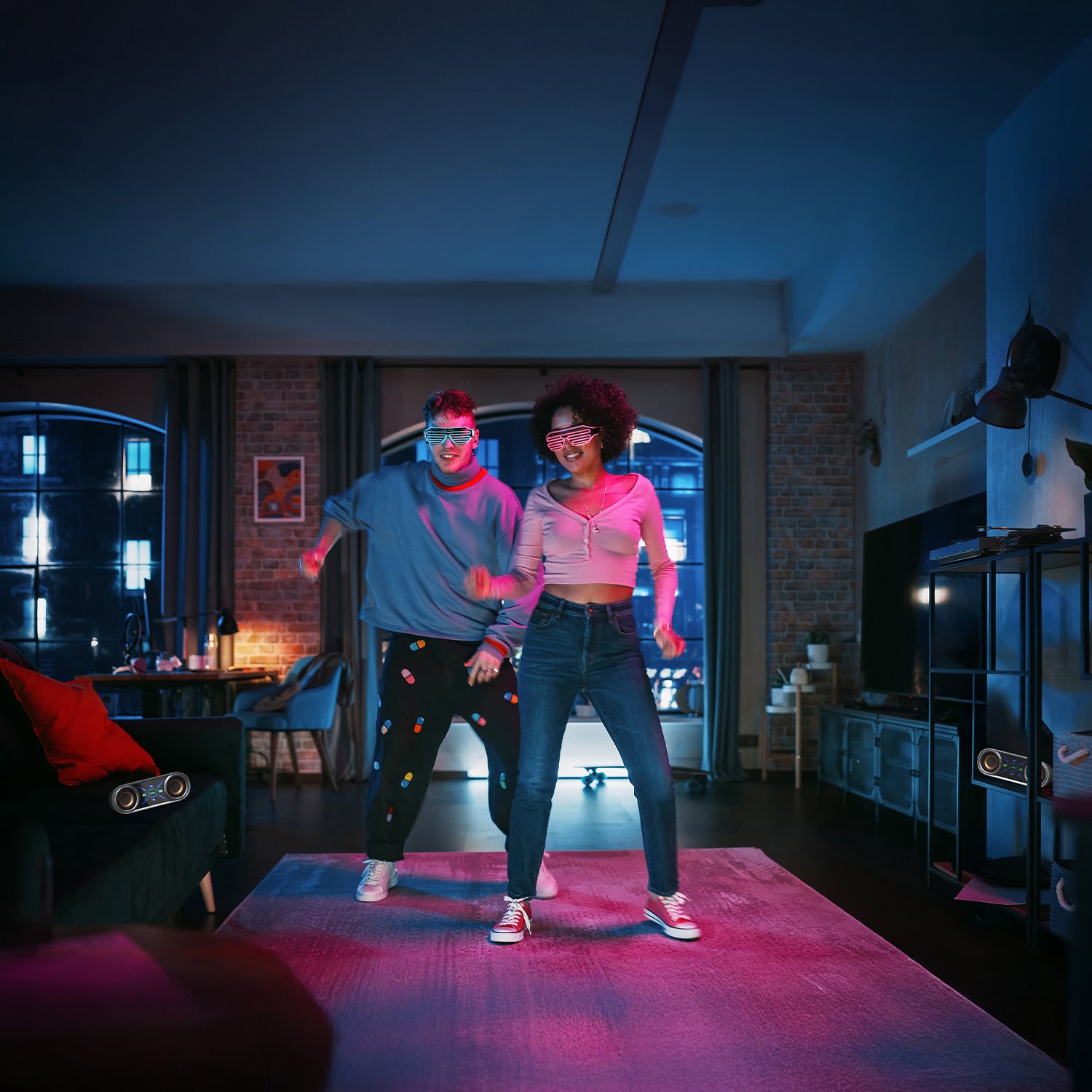 Pair two SoundBox Pro+ P400 speakers for a powerful 100W stereo experience. Enjoy an immersive audio-visual show as the phantom mirror lights sync with your music, making your party unforgettable.