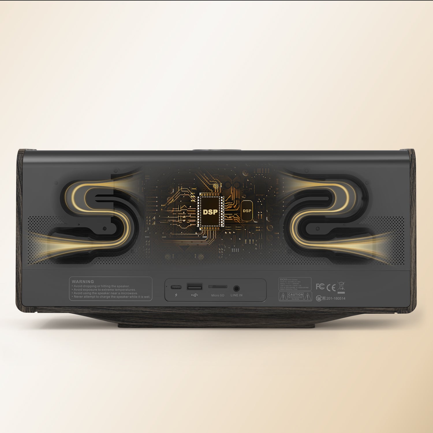 This wireless speaker utilizes dual DSP technology to enhance sound quality. It fine-tunes audio for balanced sound, compensating for the speaker box combination, and employs various audio processing algorithms to minimize distortion.