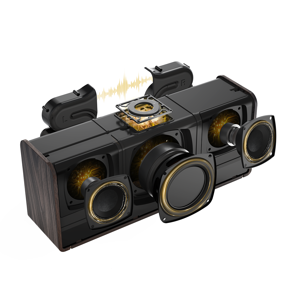 Crafted with premium metal and faux wood grain accents, this compact speaker blends modern aesthetics with classic style, adding elegance to your kitchen, living room, office, or bedroom.